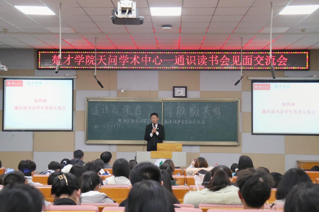 12月22日晚,通识读书会与楚才学院天问学术中心在教学楼B300教室举行读书会见面交流会。湖北大学楚才学院常务副院长朱小梅、副院长许良发出席本次会议,楚才学院学生代表和我院两百余位学生参加此次交流会。会议由楚才学院2020级文科试验班学生徐忠圻主持。