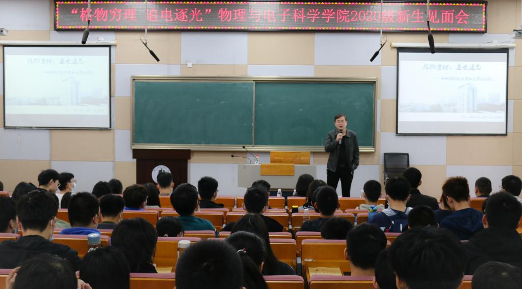 10月29日下午,物理与电子科学学院于阳逻校区B300教室开展“格物穷理,追电逐光”名师领航活动暨2020级新生见面会。物理与电子科学学院院长周斌、院党委副书记王晓玲、辅导员袁勋与思齐苑2020级新生进行面对面交流。