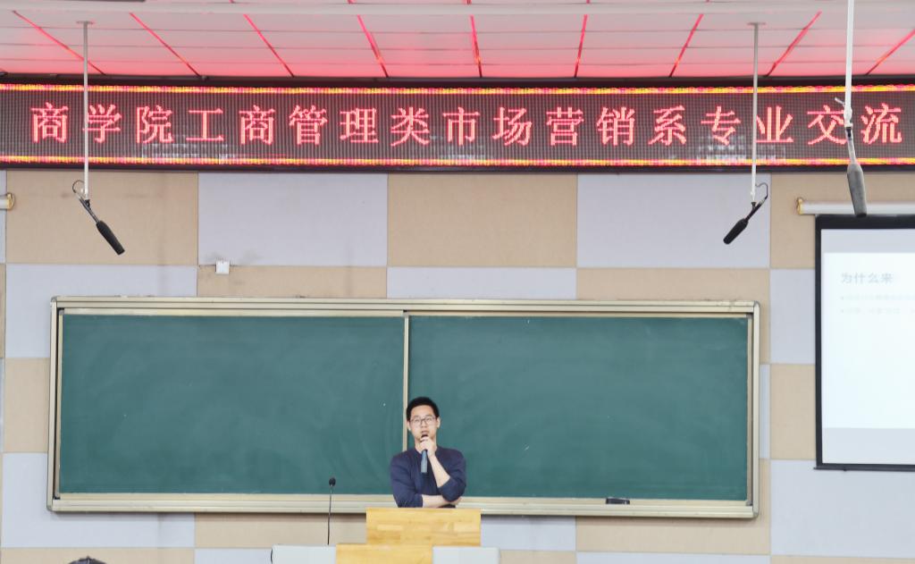贾兴平带领同学理清了概念,讲述了不同角度对营销专业的认识和理解。他从往届学生的就业去向,具体分析本专业的就业前景,打破部分人对营销“专业性弱”的错误印象。“市场调研,数据分析,宣传工作。”贾兴平提出营销活动的三个关键词,告诉大家市场营销究竟是在干什么,他把抽象问题具体化,解答了学生的疑惑。随后,年轻教师张俊芳讲述了自己的求学求职经历,为在场学生提供寻找人生方向的范例。