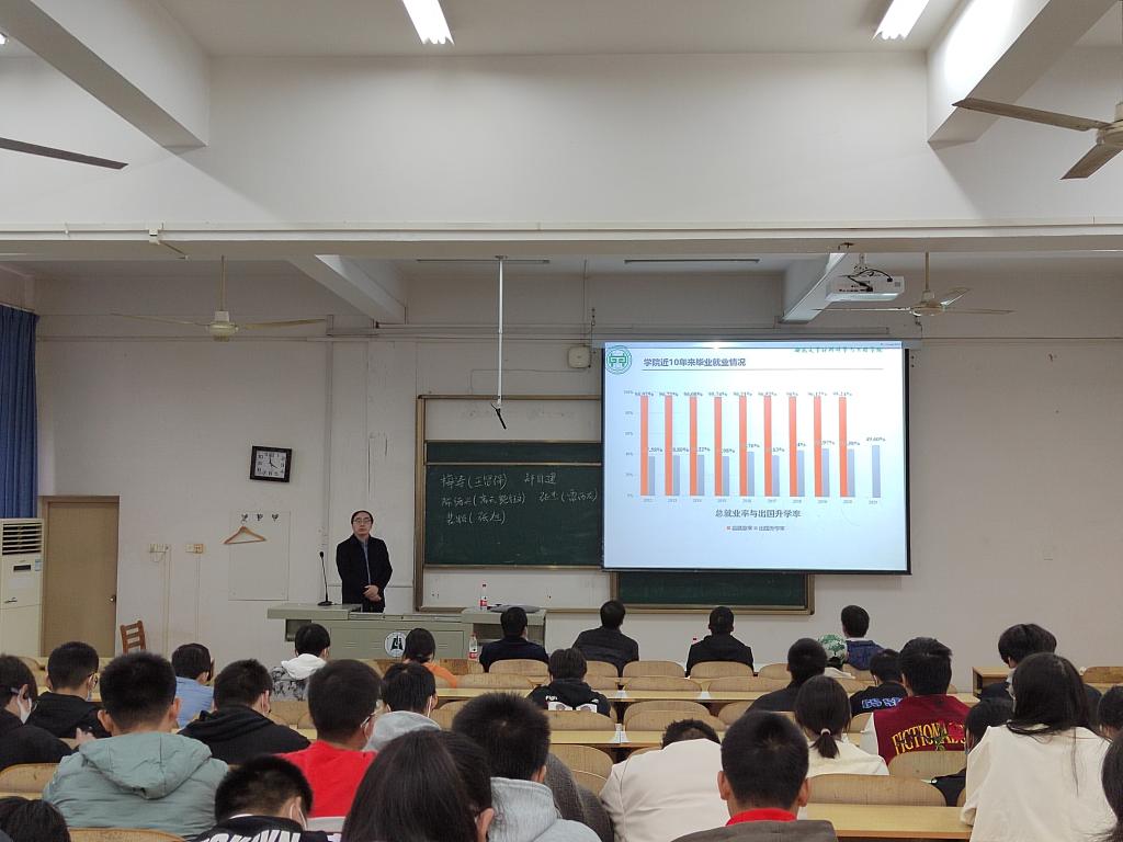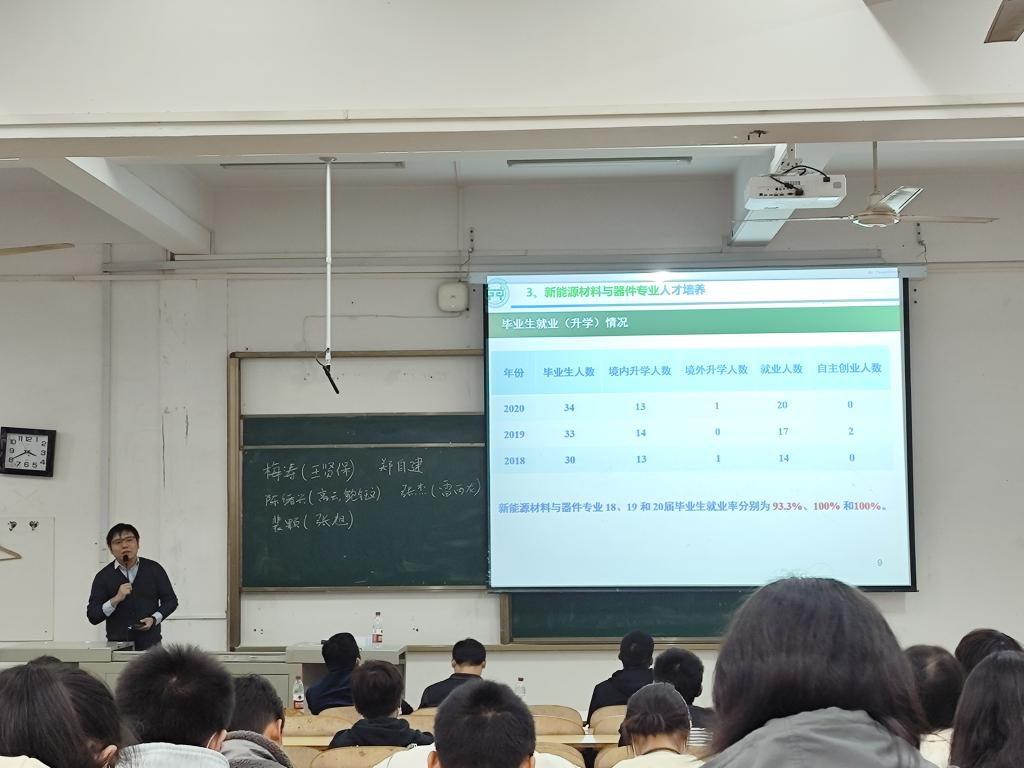 余黎就新能源材料与器件专业课程安排、师资力量两个方面展开具体讲述。“本专业世界排名由之前的3.5‰上升到2.8‰,同学们要对新能源材料与器件专业充满信心。”余黎对在场的学生们说。
