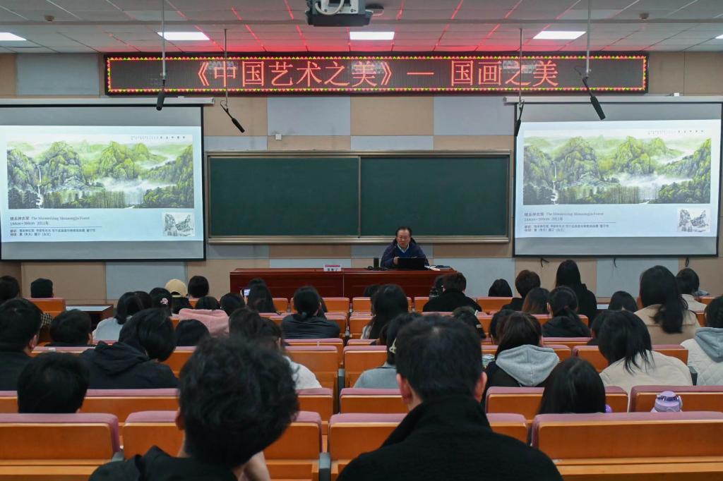 3月18日上午,中国美术家协会河山画会副会长、文化部优秀专家董继宁教授应邀到湖北大学阳逻校区讲授美育通识课《中国艺术之美》第四讲——国画之美。