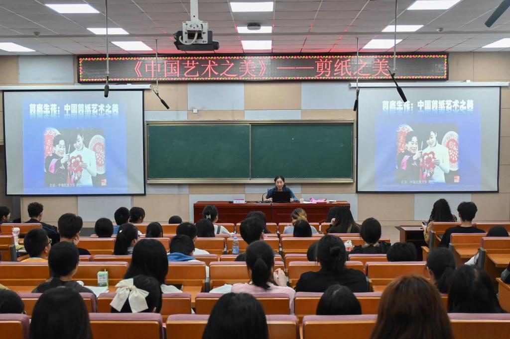 课上,何红一以“剪底生花:中国剪纸艺术之美”为主题,主要从形式美、民族美、功能美三个方面带领同学们逐步深入了解中国剪纸这一项历史悠久的世界非物质文化遗产。