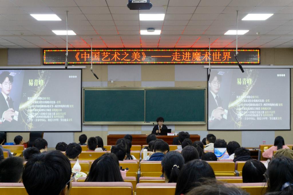 11月11日上午,湖北省魔术师协会秘书长易青峰应邀到湖北大学阳逻校区讲授本学期通识教育选修课《中国艺术之美》第四讲——“走进魔术世界”。