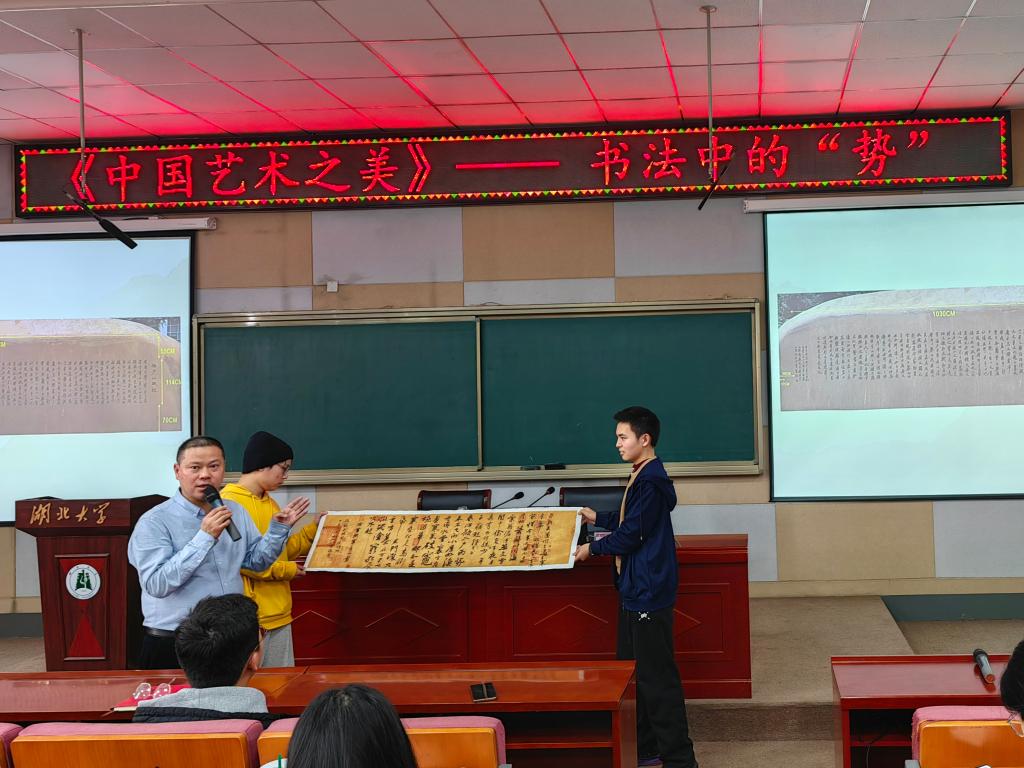 3月23日上午,湖北省书画协会副主席陈明华应邀至湖北大学阳逻校区讲授本学期A级内射毛片免费的选修课《中国艺术之美》第三讲——书法中的“势”。