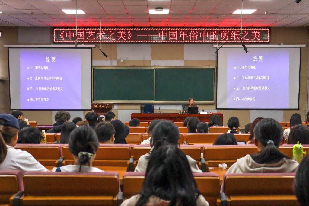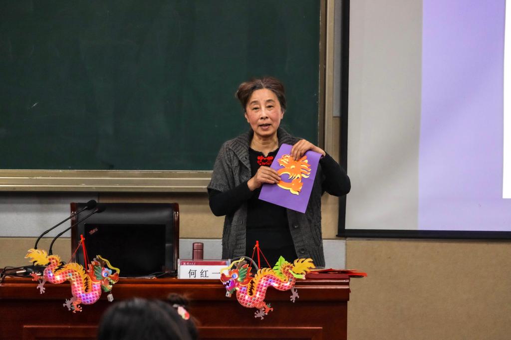 3月30日上午,中南民族大学教授、民间工艺美术家、民间艺术家何红一应邀至湖北大学阳逻校区讲授本学期通识教育选修课《中国艺术之美》第四讲——中国年俗中的剪纸之美。
