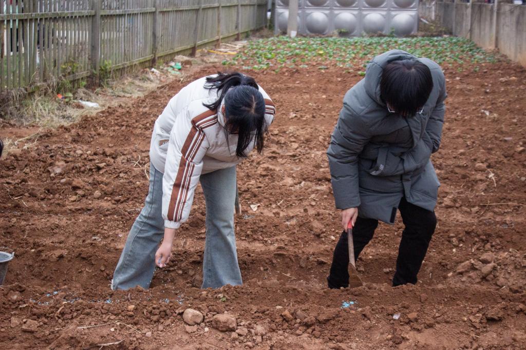 课上,李少华用锄头挖出一排排整齐的田垄。学生们撸起袖子,挽上裤脚,手拿铲子,将土豆幼种一个个放进挖好的田垄中。接着,他们将肥料均匀撒在种子周围,确保土豆幼种可以汲取足够的生长养分。最后,学生们用土将幼种埋好,用力将土地表面压实。