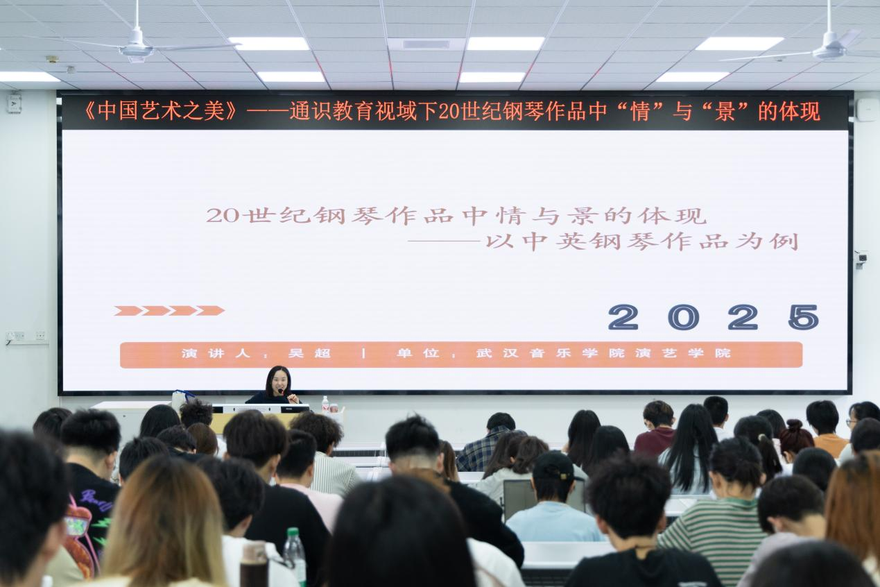 4月26日上午,武汉音乐学院副教授吴超应邀至我校阳逻校区讲授本学期通识教育选修课《中国艺术之美》第七讲——通识教育视域下20世纪钢琴作品中“情”与“景”的体现。