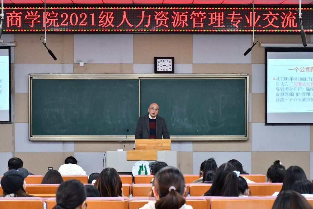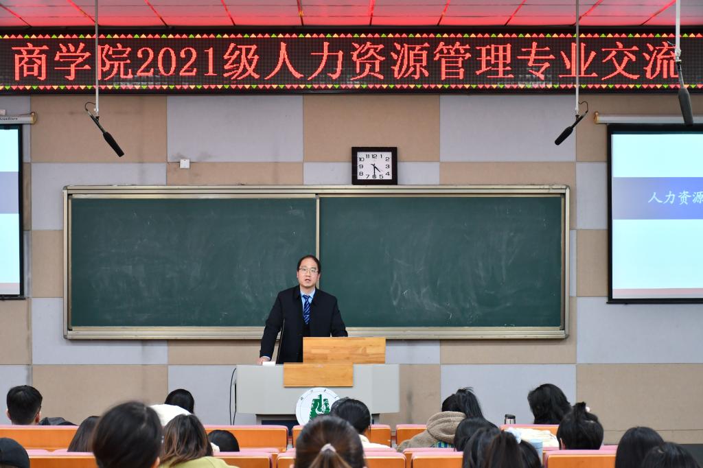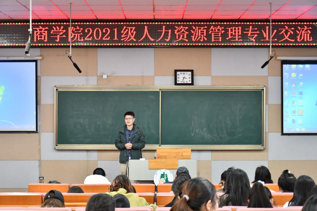 12月1日下午,人力资源管理专业在A级内射毛片免费的B300教室开展专业交流活动。商学院执行院长郭志文教授、人力资源管理系叶红春教授、杨俊副教授、王圆圆副教授、李琼老师、林叶老师以及2017级人力资源管理专业保研学长曾建鹏和2021级工商管理类专业全体学生参加此次会议。会议由商学院人力资源管理系教工党支部书记林叶老师主持。