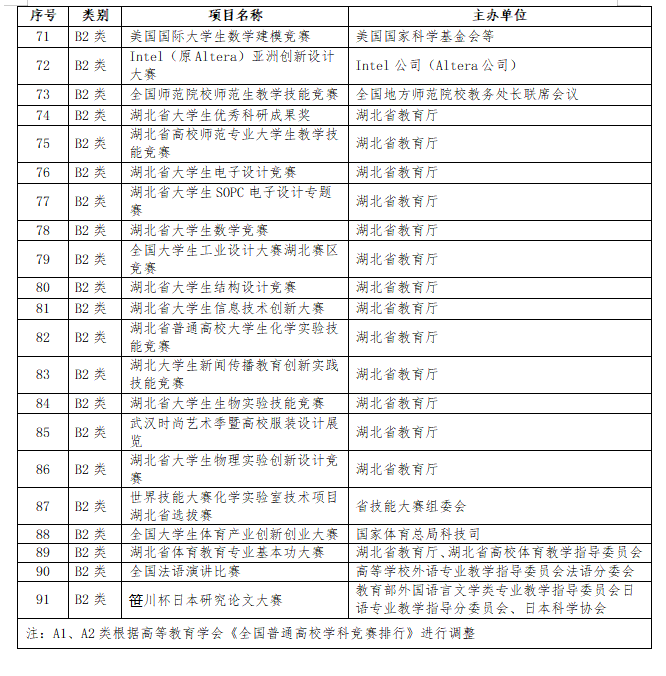 B2类:未纳入B1的,但为教育部高等学校教学指导委员会各专业分委员会、国际大型企事业单位、湖北省教育厅、有关司局和重要学会(协会)等组织机构主办的具有较大影响的竞赛。