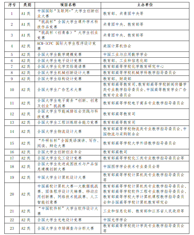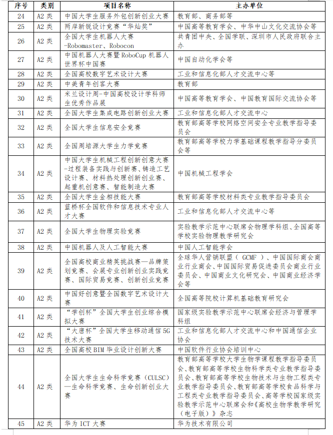 A2类:由中国高等教育学会认定的重要学科竞赛和有重大影响的国际竞赛;