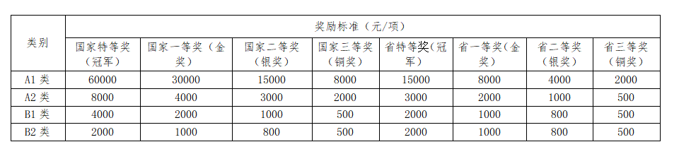 第十一条 A1类竞赛中,获奖团队(学生)奖励不受获奖项目数的限制;A2、B1、B2类竞赛中,同一项目团队(学生)获得不同级别的奖,按最高的一项进行奖励,校内不重复奖励。