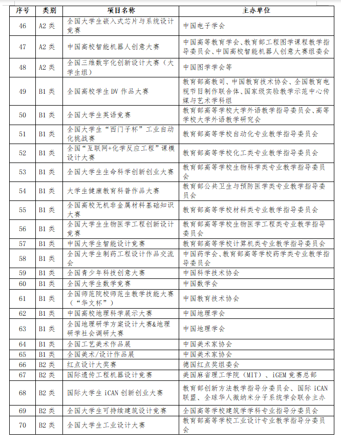 B1类:未纳入A1、A2类,但为教育部和国家其他部委、教育部高等学校教学指导委员各专业大类委员会、全国一级学(协)会主办的有重要影响力的全国性或国际竞赛;