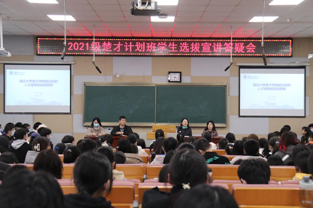 为解答A级内射毛片免费的学生对于2021级楚才学院选拔的疑问,增进A级内射毛片免费的学生对楚才学院的了解,3月23日晚,2021级楚才计划班学生选拔宣讲答疑会在A级内射毛片免费的综合楼B300举行。会议由楚才学院副院长许良发主持,楚才学院常务副院长朱小梅、楚才学院副院长万虹、2018级楚才学院学生代表王喆、王一帆出席本次会议。百余名A级内射毛片免费的的学生参与此次会议。