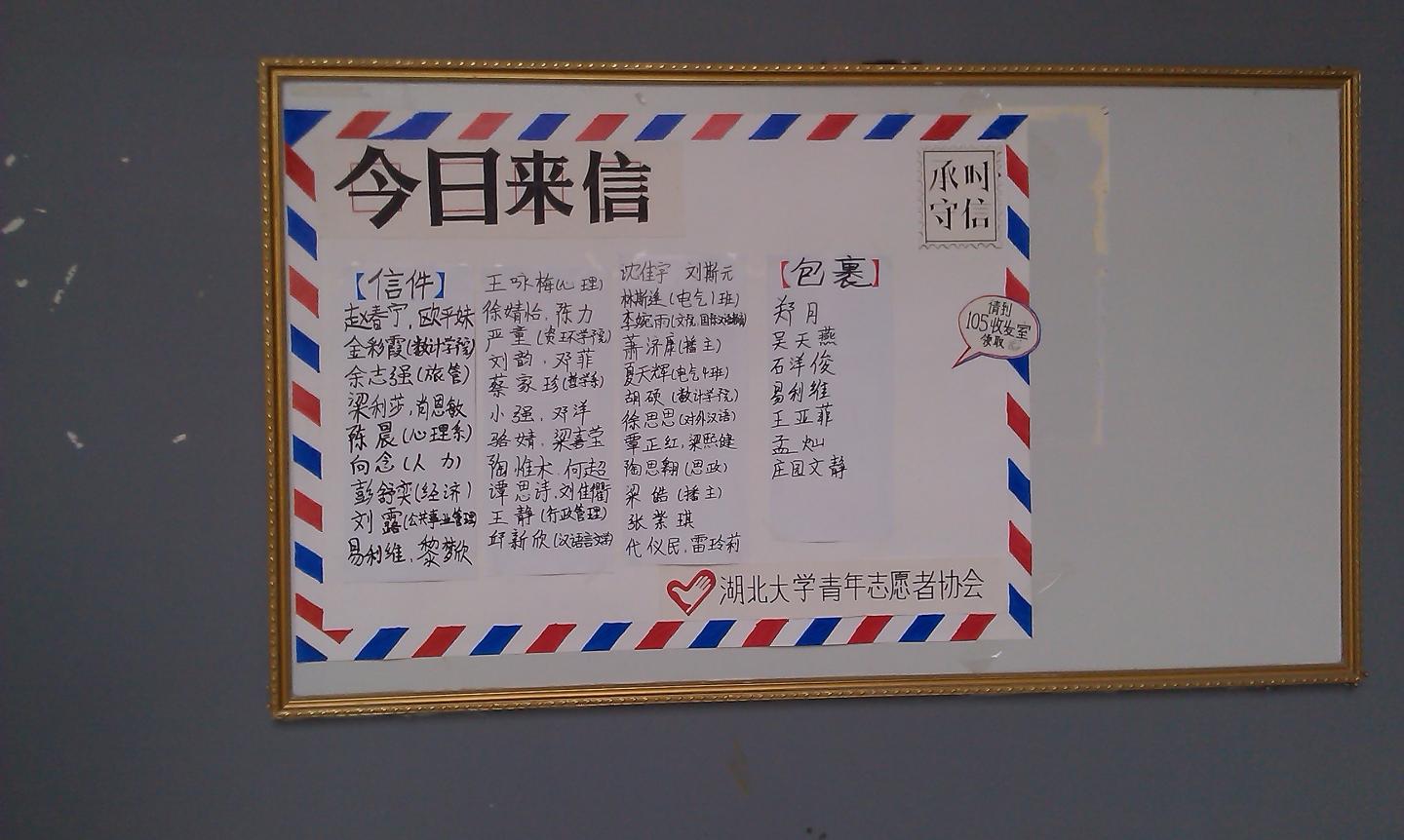 “学校收发室经常会有很多无人领取的信件。”活动的策划者马亚芳同学告诉记者,收发信件消息长期闭塞,缺乏公开的通知栏是导致信件堆积问题的关键。“正值三月雷锋活动月,希望借此活动解决大家‘等信烦、收信难’的问题,目前已经得到很多同学的支持和响应。”