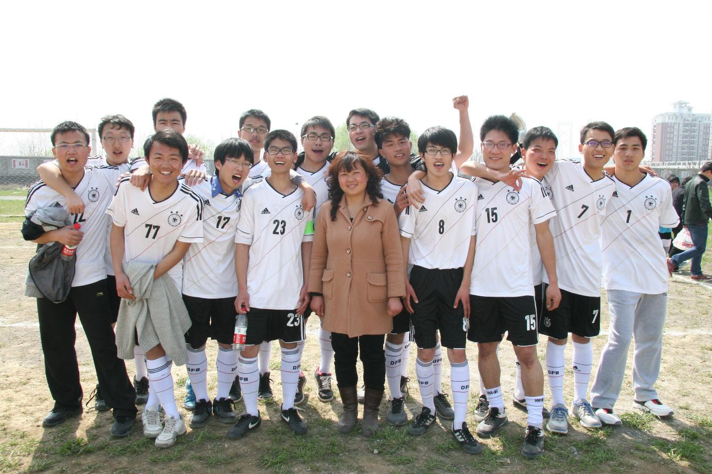 上半场中,球赛刚开始,身着白色队服的正心队员便极力向对方进攻,由于队员之间的积极配合,正心队多次攻入对方防守阵营。面对正心的激烈进攻,里仁的防守亦不可不谓之严密,整个上半场,正心的进攻总在千钧一发之际落空。短暂的中场休息之后,里仁队改变策略,以退为进,步步后退进而来了一个空中传球,将球送进了对方球门,瞬间赢得全场掌声欢呼声一片。“塞翁失马,焉知非福?”这出人意料的一球不但没使正心队泄气,反而完全激发了其全队的斗志,队员杨龙更是顽强拼搏,即使手臂和腿部几处摔伤,依然选择与队友一起坚持到最后。终于在大家的团结一致、锲而不舍的进防兼顾之下,一球从空中飞向了对方球门,赢得了一分。接下来的几分钟里,双方队员你坚守球门我亦不松懈,时间用完,双方始终保持着1:1的状态,于是紧接着进入点球决胜负的关键时刻,即使汗流浃背、疲惫不堪,双方队员仍努力专注于最后一刻。正心队队员以一招声东击西点进3球,里仁则遗憾地点进一,最后裁判以点球3:1宣布本场比赛正心队胜出。比赛结束,两队队员一起合影。