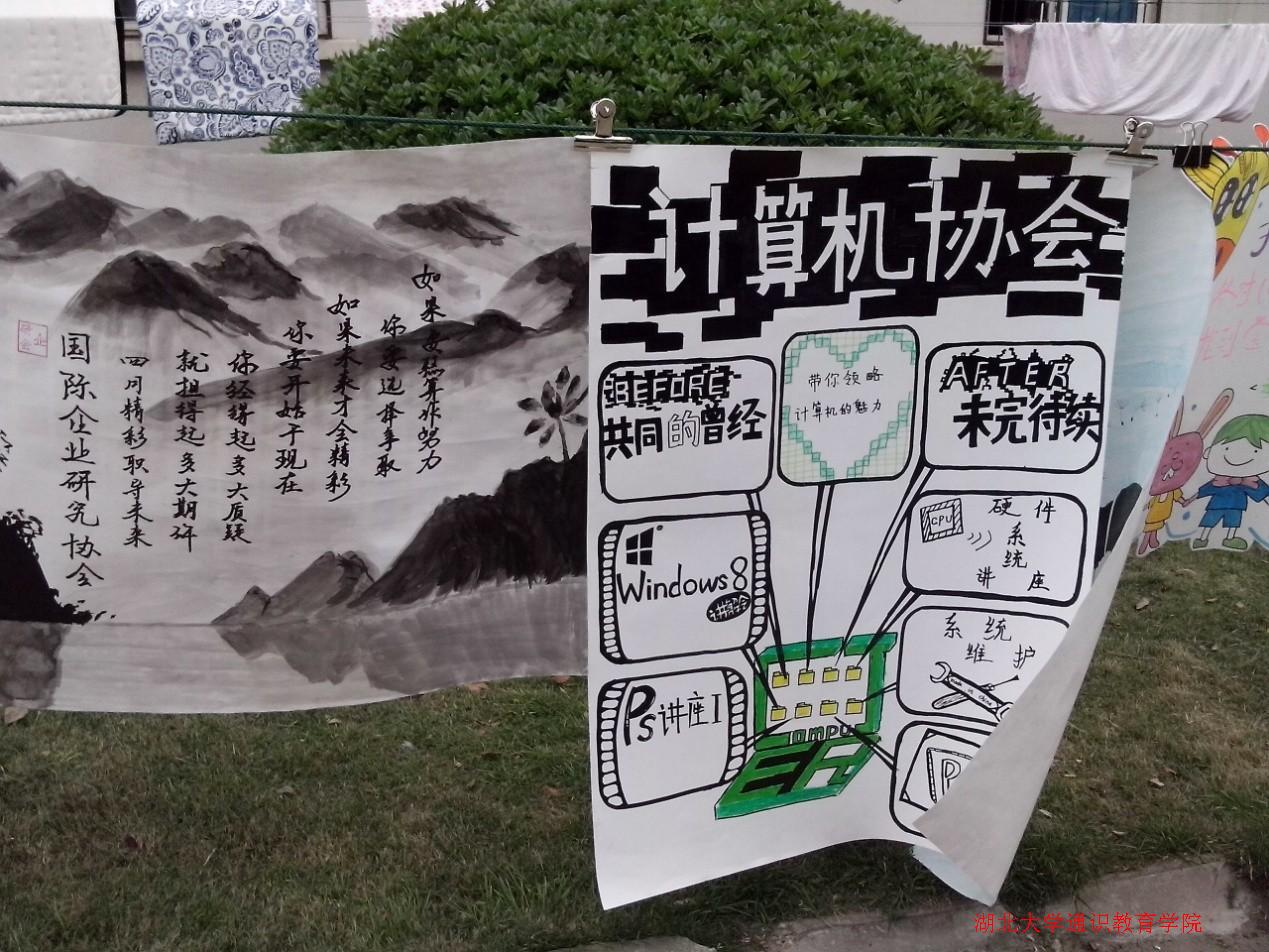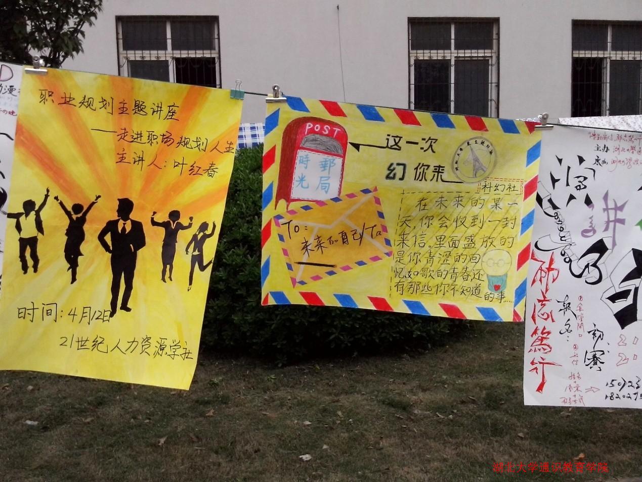 记者在食堂门口的林荫道两旁看到了悬挂得整整齐齐的海报,它们是各大社团精心制作的作品。记者看到,每一张海报上面都有重点突出的社团名称,并且写有体现社团文化的标语,还有精美的图画和绚丽的色彩做陪衬,一片“百花齐放”的景象。当然,在众多海报中不乏创意之作:新闻与广告协会的海报由从报纸上剪下来的各种新闻拼接而成;会计协会为了呼应举办的“点钞大赛”活动,在海报上巧妙地贴上了“点钞币”;而司南剧社则制作了立体的舞台和演员贴合在海报上……