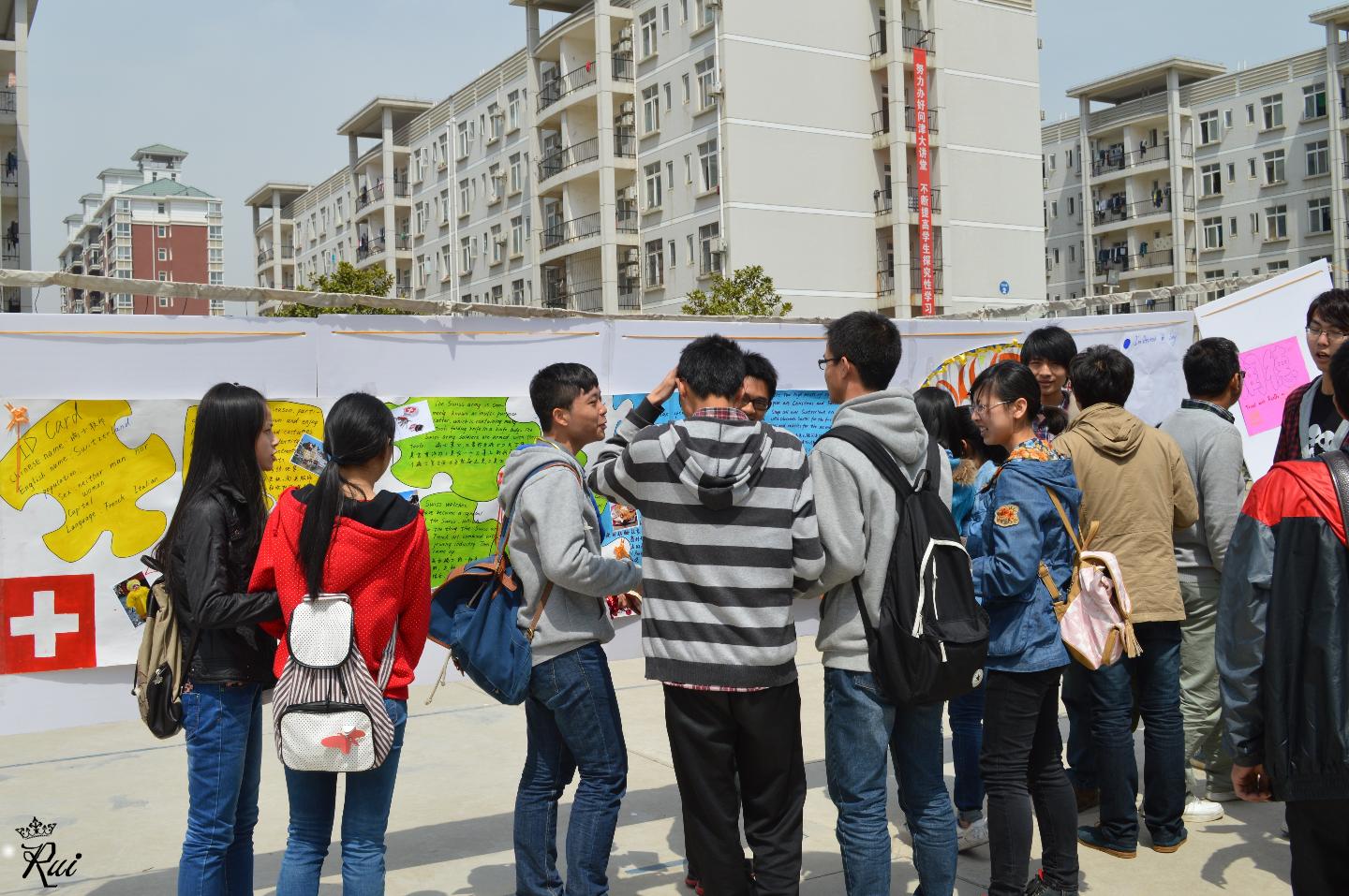 当天中午,宣传部负责人带领习苑学生到排球场布置场地,同学们额齐心协力将海报附粘在展板上并高高挂起,顿时引来许多师生的观看,6位解说员纷纷带上工作牌开始解说,用流利的英文仔细为观看者讲解,准备得及其充分。同时还设有抽奖答题活动,许多同学积极参与,体会英语的趣味并深感欢乐。有观众表示此次展览内容非常丰富,不管是从外在的设计布局,还是从内在的内容深度来看都非常给力。历时30分钟的展览很快就结束了,但同学们仍不忍离去,十分热情地在英语签名板上签上自己的英文名以及个人英语心愿,为了纪念这有益而又欢乐的活动,活动负责人征求楚英俱乐部主办人的意见后决定将展板续展一下午,供各位同学观看、学习,体会瑞士的种种风情。