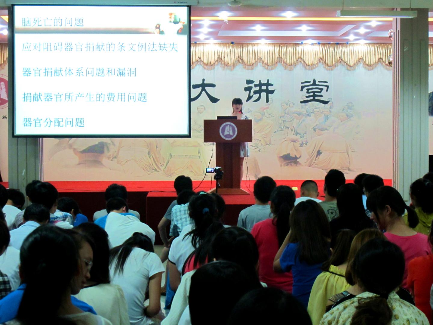 黄意首先讲述了中国年纪最小的器官捐献者何玥的故事,由此引出她的演讲主题——“浅析我国器官捐献问题及政府解决途径”。黄意的演讲不仅融入了感人至深的故事,最大的亮点是她的演讲还结合了自己作为一名器官捐献志愿者的感受与体会。她向同学们展示了自己的器官捐献志愿者资格证,并讲述了自己办理此证的艰难,“就为了取一个证件,我必须从阳逻坐车到武汉红十字会,办理手续之后还要从武汉回到我的家乡贵州征求我父母的同意并让他们签字,办理过程太复杂了,幸好,我成功办理此证,成为一名器官捐献志愿者。”她表示,器官捐献不仅是生命的升华,也是生命的延续。感人且真挚的演讲为她获得观众们的阵阵掌声。