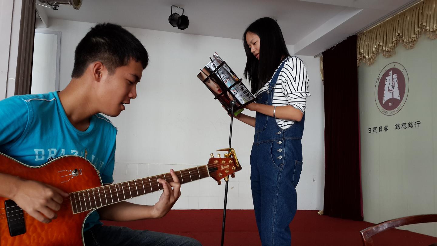 当我们见到钱坤和陈琎的第一面时,他们正在学校问津大讲堂进行彩排。我在门口不自觉的停下了脚步,仔细看了看他们俩。钱坤穿着蓝色休闲T恤,气质优雅平易近人;而陈琎则是一副邻家姑娘的打扮,穿着俏皮可爱的背带牛仔裤,显得青春活泼。当我们的上前去打招呼时他们才停止了彩排,并对我们点头微笑致意。
