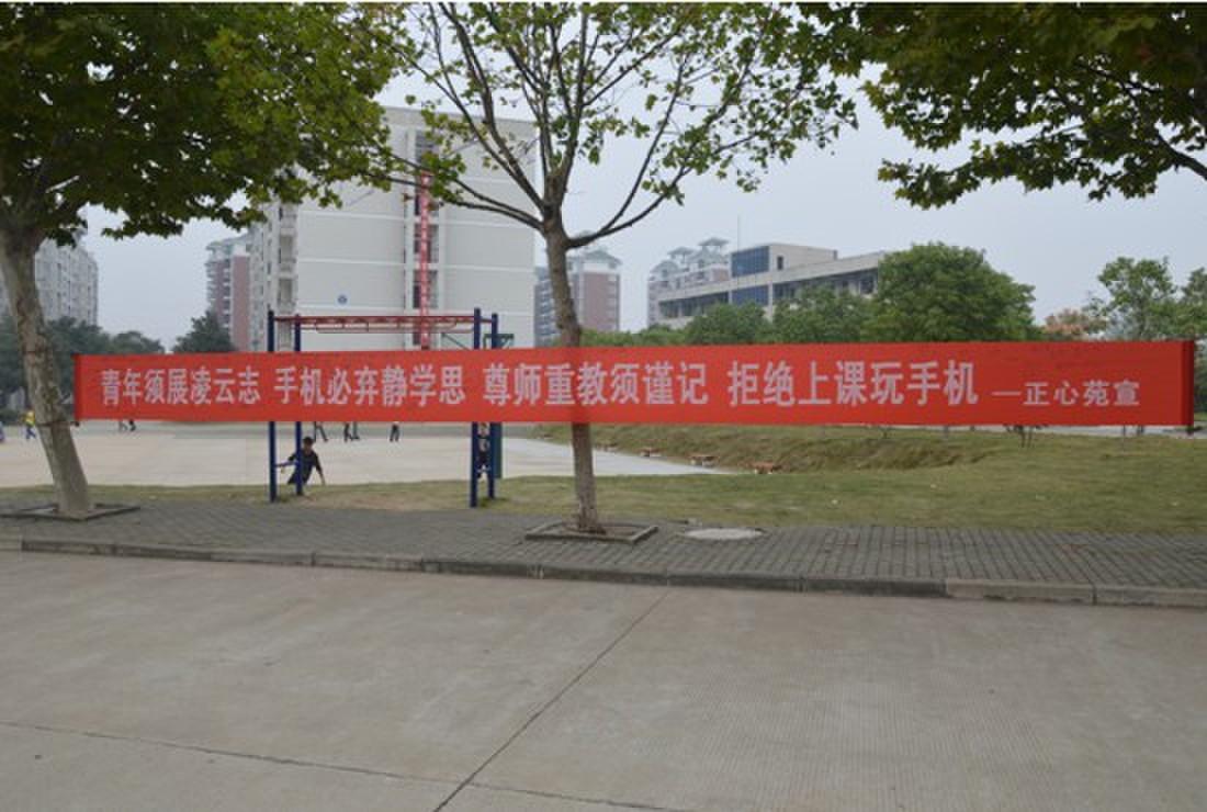 “青年须展凌云志,手机必弃静学思。尊师重道须谨记,拒绝上课玩手机。”这是正心苑挂在篮球场旁边一则标语。