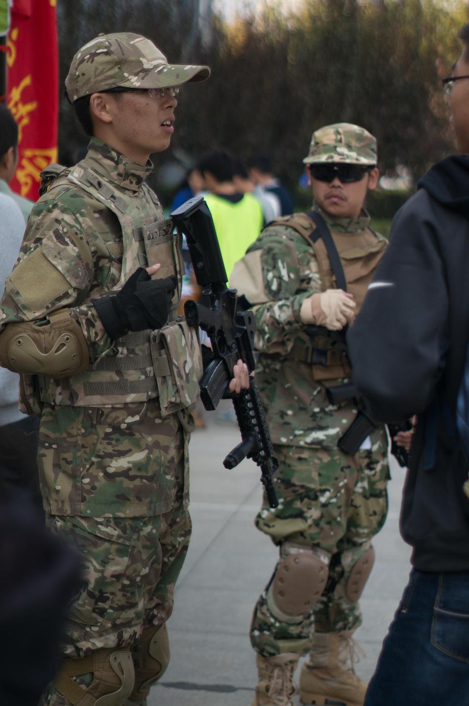 身着土黄色的迷彩服,头戴单兵头盔和制式护目镜,手端M4A1自动步枪,脚蹬一双沙漠靴。26日上午,英姿飒爽的大兵们一出现在招新会场就立刻吸引了大批军迷们的眼球,观察协会举手投足间更引起了同学们的热议。招新台前几位身着解放军军服的同学热情的介绍着军事的相关活动。