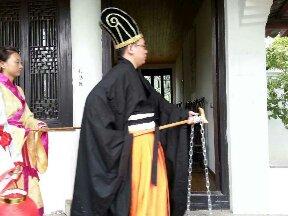 深秋微凉,艳菊竟放。击鼓敲钟送传音,献官纠仪诸就位,祠堂庭院人树立。三位献官依次行礼,鞠躬,稽首,并由正献官恭读祝文,铿锵有力的声音穿透秀雅的围墙,余音回荡。鱼贯而出的汉服背影映衬着黑白的径道,恍若隔世。