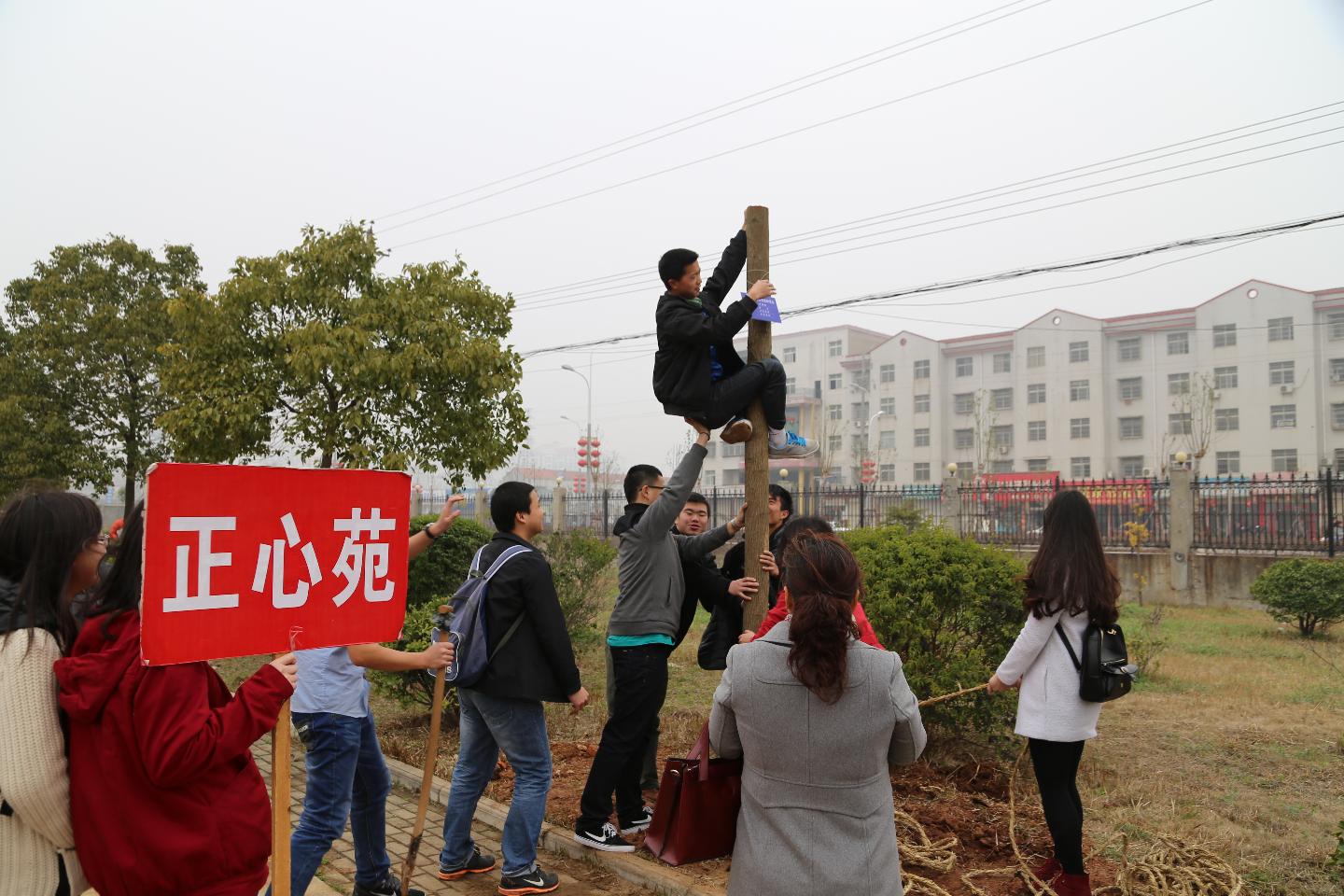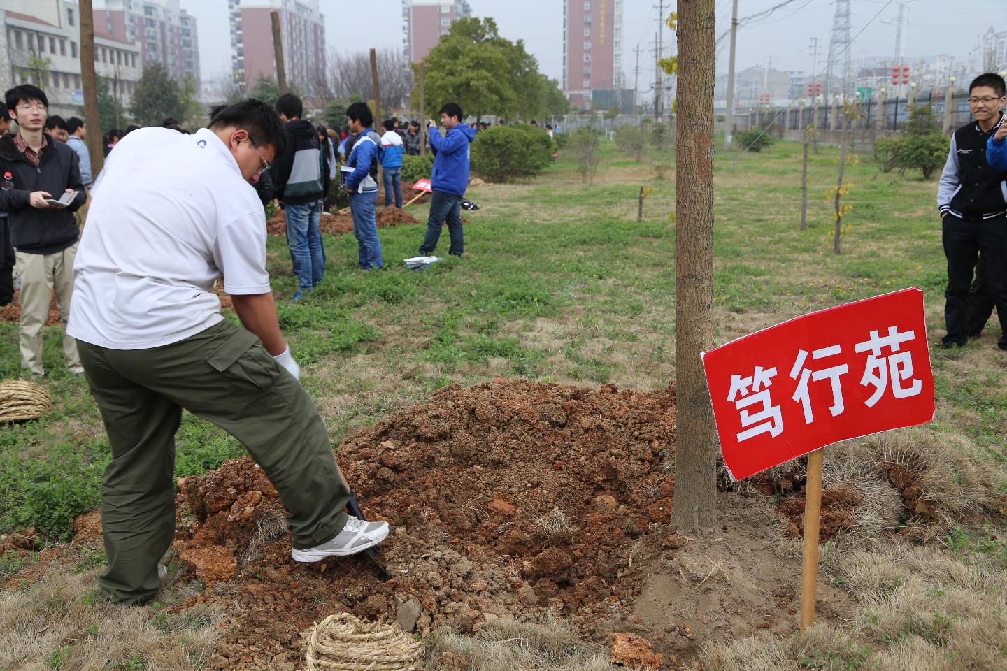 男生在活动中挑起“大梁”,汉语言专业的王帅身穿短袖、戴着手套,扶苗、培土、踩实,做的却是一丝不苟,而正心苑的一名学生在帮助下爬上树顶挂上习苑牌,引来不少同学的围观。