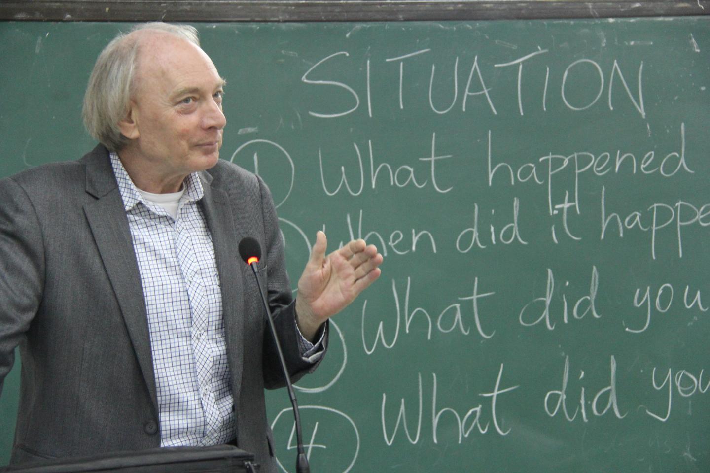 Maichael首先鼓励大家上台分享有趣难忘的故事。来自工商管理的王晶勇敢地走出来,她讲述了学生卡丢失,同学们帮忙寻找并借出卡以帮助自己解决生活困难的故事。“在讲台上的时候我很紧张,但是Maichael老师一直在旁边提点我,让我把故事更完整的叙述出来。”随后几位同学纷纷上台讲述自己的生活趣事,现场时不时地爆出阵阵欢笑声。接着,Maichael分享自己经历的搞笑事故。 Maichael曾在飞往华盛顿的航班起飞前将行李和夹克都置于飞机中,而他却在候机室休息,有人走来告诉他误了飞机。他看着时钟不相信地说离飞机起飞还有十几分钟。谁料想飞机提前起飞20分钟,“Oh,My God!”于是他的朋友和行李在华盛顿等着他的到来。同学们听到了Maichael的爆料,个个捧腹大笑。