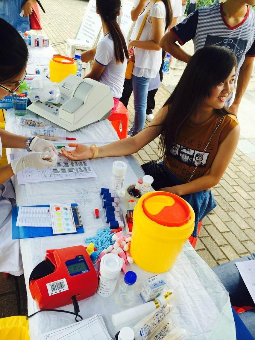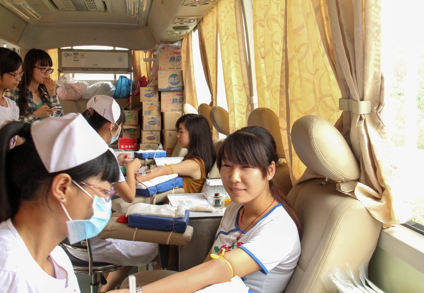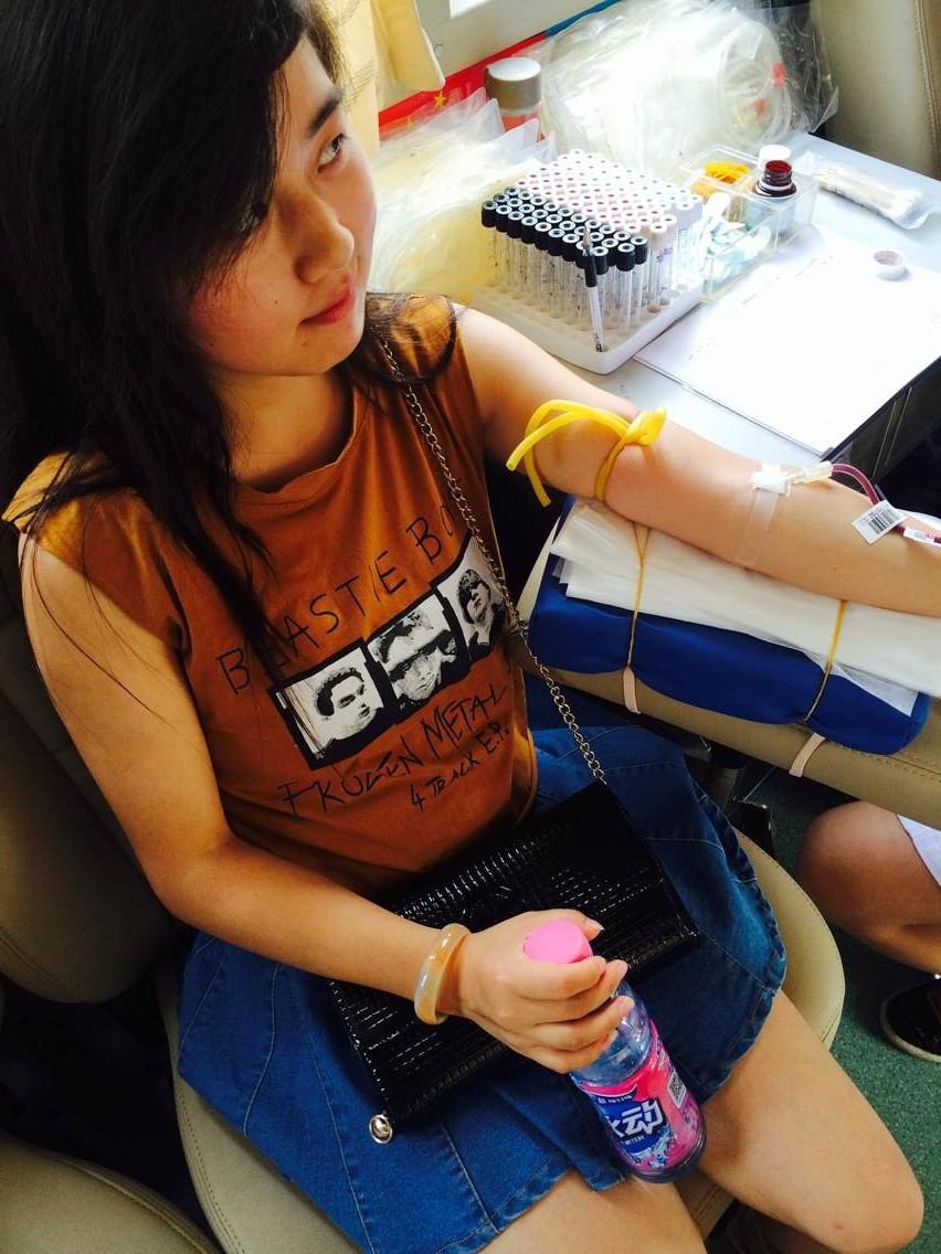 据了解,本次参加献血的学生大都是人生第一次献血。来自商学院的谭莉娟也不例外,她看起来瘦弱却俊秀的脸上透露出一丝激动。她并不像其他献血者一样坐下来喝水休息,反而和她的志愿者同学们一起帮助医务工作者做一些准备工作。当被问及这次献血的原因时,她回答说自己早就有献血的打算了,由于之前年龄未满十八周岁,只能陪妈妈一起去献血,此次能够亲身参与,她十分兴奋。经过血红蛋白含量、乙肝病毒、肝功能、血型四项检测之后,她作为今天第一个献血的“女汉子”勇敢地走上了献血车。一系列的鲜血准备工作后,粗大的献血针头扎入了她的手臂。整个献血过程进行的十分顺利,谭莉娟的气色状态也十分良好。献血后,谭回顾说,“其实刚开始还有些紧张害怕,但在医生的耐心疏导以及志愿者送饼干送水的热心呵护下,她很快调整好了心情,献血的过程也并没有想像的那么疼”。她调侃说,再献200毫升也没问题!这个内心充满阳光和爱心的女孩在捐献了300毫升血液之后开心又满足的继续她的志愿者工作了。她还说以后打算号召身边更多有爱心的同学、朋友们一起加入献血活动。