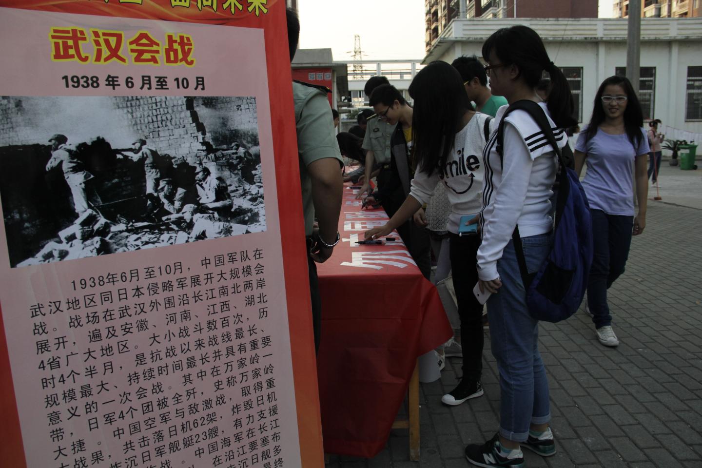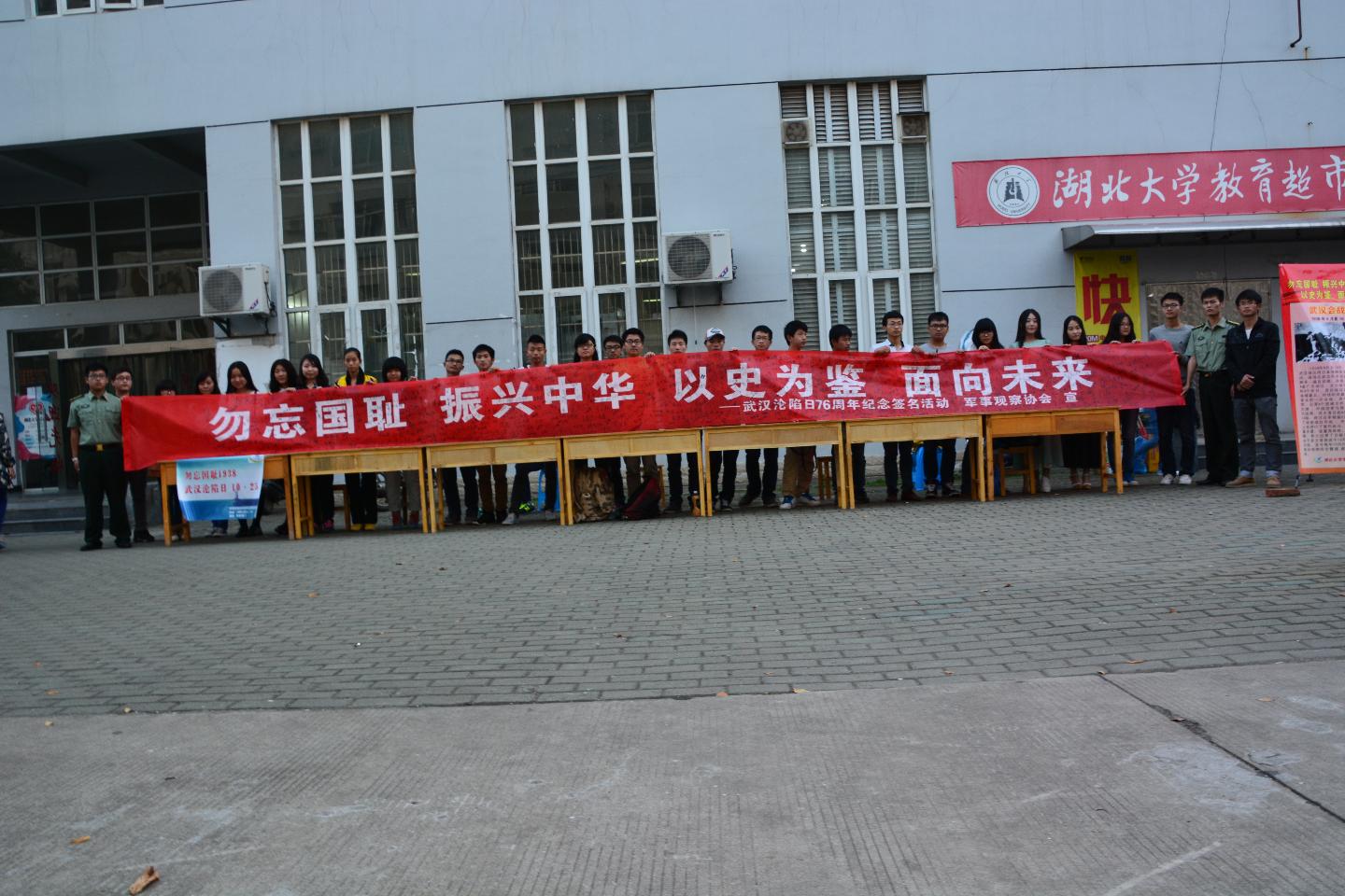 10月25日是抗日战争武汉沦陷76周年的日子。为了更好的引导和培养大家的爱国主义情怀,勿忘国耻,奋发图强,10月25日,湖北大学军事观察协会在A级内射毛片免费的问津苑侧门举办了抗日战争武汉沦陷76周年纪念活动,以号召师生在“勿忘国耻 振兴中华 以史为鉴 面向未来”的横幅上签字为主要形式。