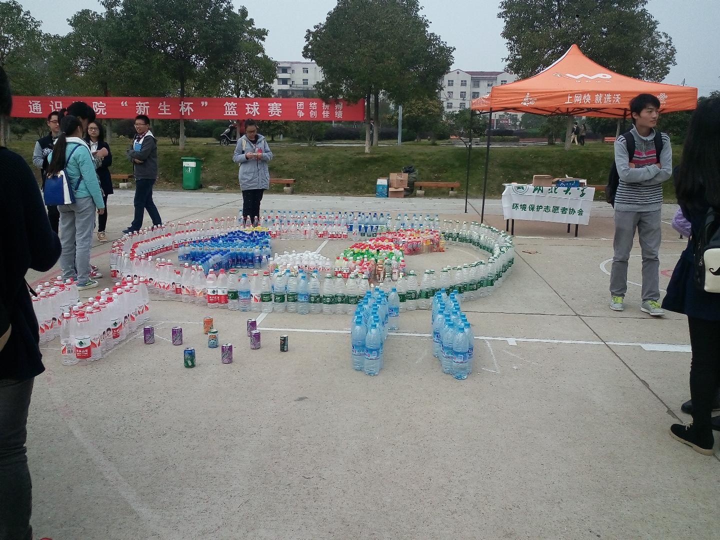 清晨7点半,同学们在去上课的路上留意到篮球场上有一些被摆放成奇怪形状的饮料瓶。原来,这是环境保护志愿者协会开办的漂流瓶活动。笔者从环境保护志愿者协会会长孙锦处得知,地上的饮料瓶是他们平时在食堂和宿舍里集中回收的,本想着拿到废品收购站处理掉,没想到在今天这个特殊的日子起到了作用。
