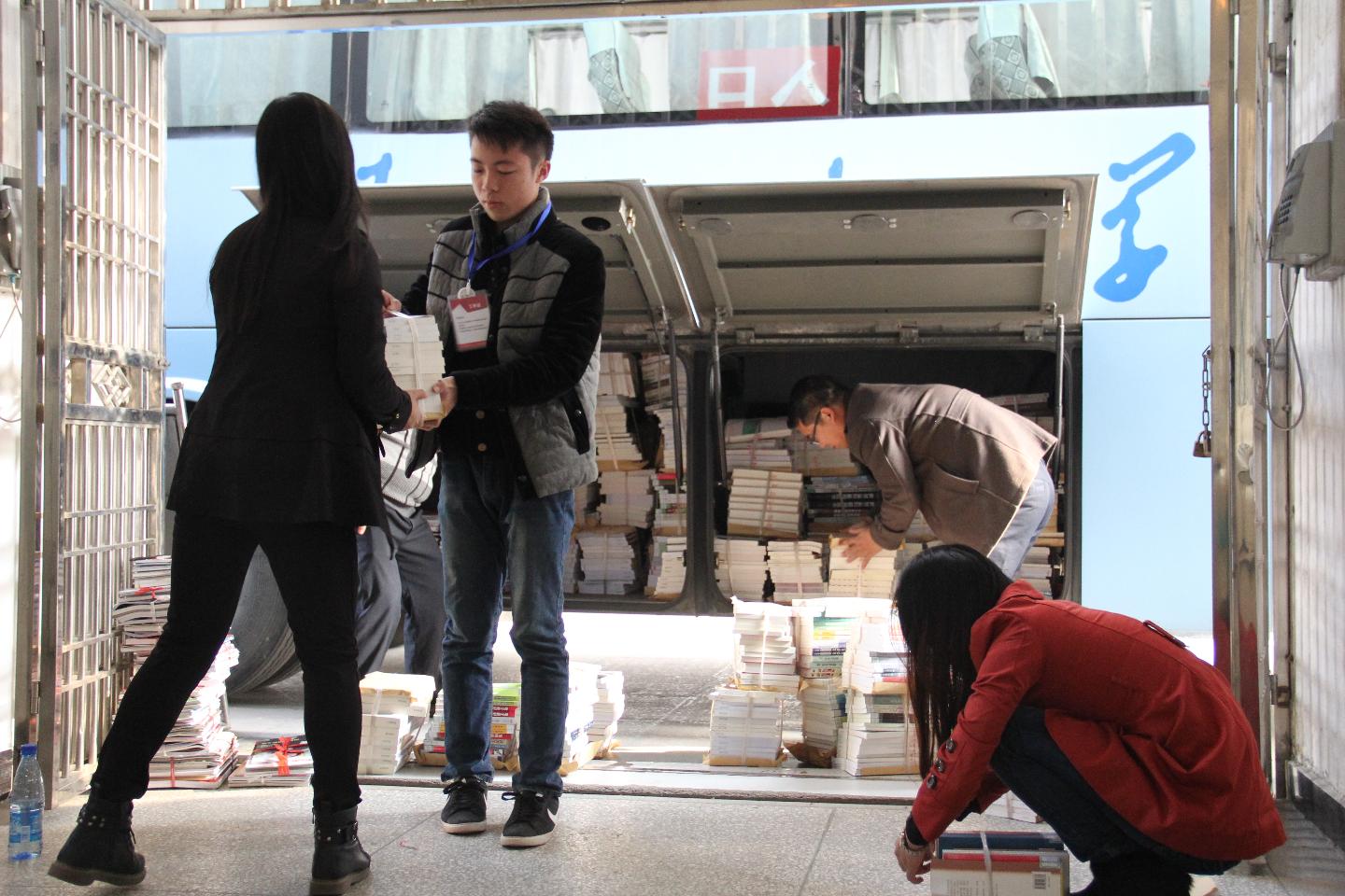 中午两点,同学们在行政楼前集合。因为正是上课时间,志协五十多名干事只有少部分可以赶到。志协负责老师,明俊苑辅导员甄国辉紧急调来十多名明俊苑的同学前来帮忙。经过志协主席张杨宝的详细分工,大家都明确了各自的任务。同学们都分布在不同的楼层,每个人将图书传递到下一个人手上,进行接力式搬运。
