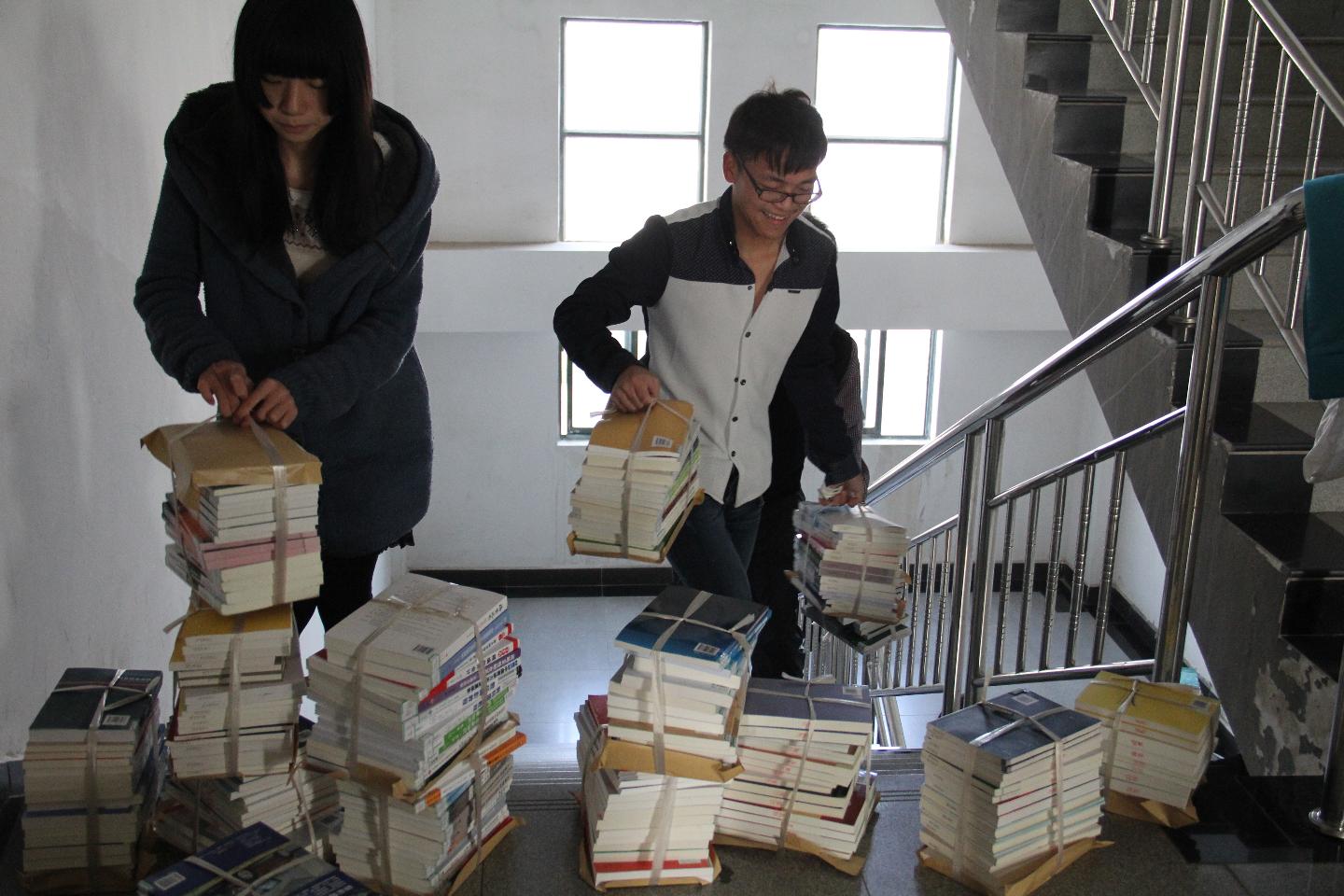 经过一个小时的努力,三千册图书进了新家。整齐地摞好的新书占据了图书室的半个房间。每一摞书,都是志愿者们用汗水传递的。“这次搬书,其实挺有意义的。能为图书馆增加新资源,累点就累点,无所谓。”志协活动部干事余翔笑着说。