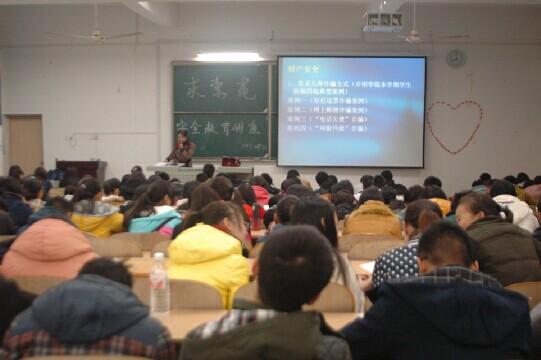 为维护大学新生的人身、财产安全,提高大学生的安全防范意识与自我保护能力。周惠玲从安全教育的意义、安全教育的分类和如何提高安全防范意识三个方面为大家做了详细地介绍。在讲座中她结合我院近两年来所发生的一系列诈骗案件为大家着重讲解了如何提高同学们的财产安全意识。并通过事例分析,揭露了几种诈骗分子常用的诈骗方式并给同学们以提醒。与此同时,她还强调应该重视自身的政治安全和生命安全。并运用几个发生在她自己身边的例子,给我们今后的生活加以提醒和建议,并告诫我们珍爱生命,远离危险。