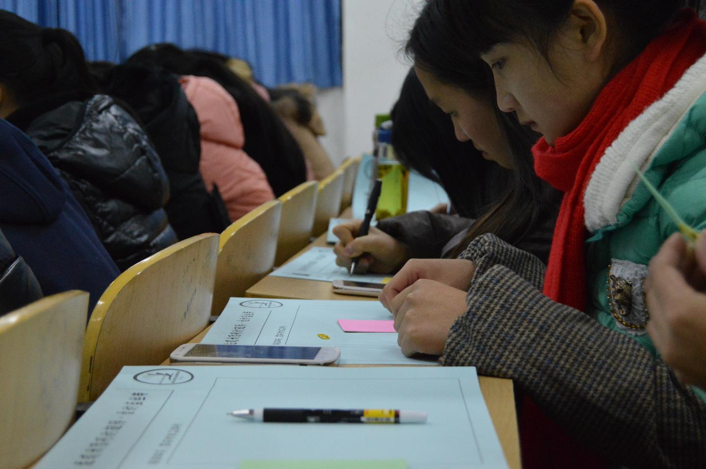 12月9日晚7点,一百多名来自会计学专业的学生陆陆续续走进了222教室,在这个教室的每张桌子上都整整齐齐地摆放着一张精致的蓝色卡片和十张便利贴,同学们坐下后,经过他们班长的一番介绍,他们便开始用手中的笔填写起了便利贴,用他们填好的便利贴装饰着蓝色卡片。