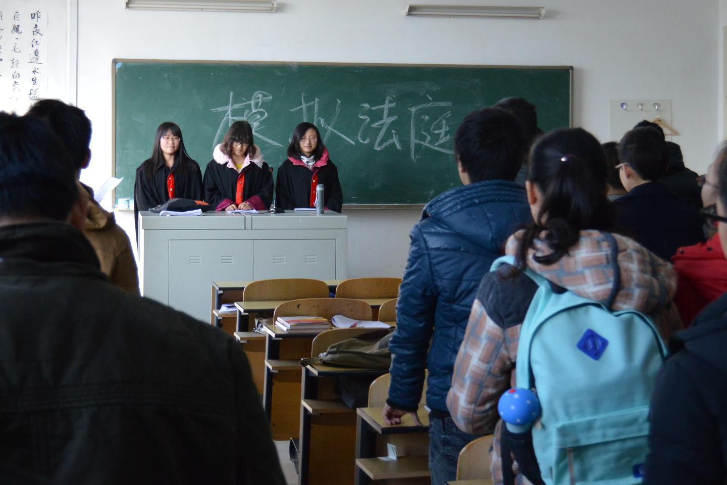 “哎!法学课上法律条文太多!”一位思想政治教育专业的学生道出了他们对法学课的心声。然而,12月17日,在318教室,三十多名学生用模拟法庭的形式,让单调的法学课堂充满了生机与活力。院长高天琼、求索苑辅导员周慧玲应邀出席观看了这个特别的课堂。