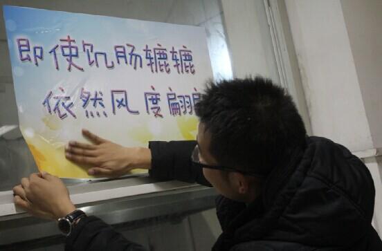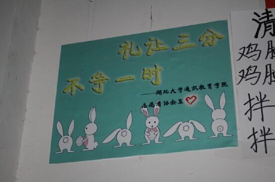 12月23号的元旦晚会结束之后,志协的同学们在食堂各处张贴了文明标语,诸如"食为天,礼为先"、"排队排才对",志愿者们希望能用这样的方式让文明深入每个同学们的内心,为武汉创建文明城市做一份贡献。