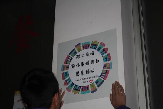 “书山有路勤为径,学海无涯苦作舟”当你在教室中看到这样一幅昂扬有力的书法作品,不知是否能够激发你努力上进的学习精神呢?紧接读书卡片进食堂的活动后,志愿者协会又与书法协会合作,整合数十张书法作品,在宣纸上写好,在卡纸上印好,在墙上贴好。
