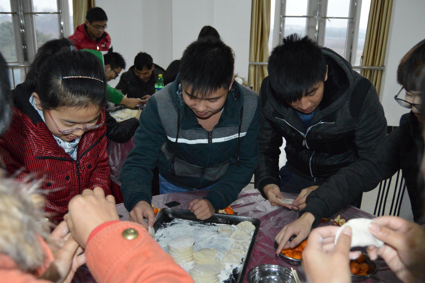 然而,在现场我们发现这样一位同学。和面,搓团,擀面,包饺子……一套熟练的动作下来,一个精致小巧的饺子呈现在大家面前,引得众人纷纷喝彩。不少同学挤上来向她求教。她笑着向我们说道:“我来自河南,每到过年或者过节时我们家都会包饺子,所以久而久之,我也学会了包饺子,现在包起饺子来我已经很熟练了。今天我们班的同学聚在一起包饺子,有一种一家人在一起过节的感觉!让我感受到了家的温馨。”