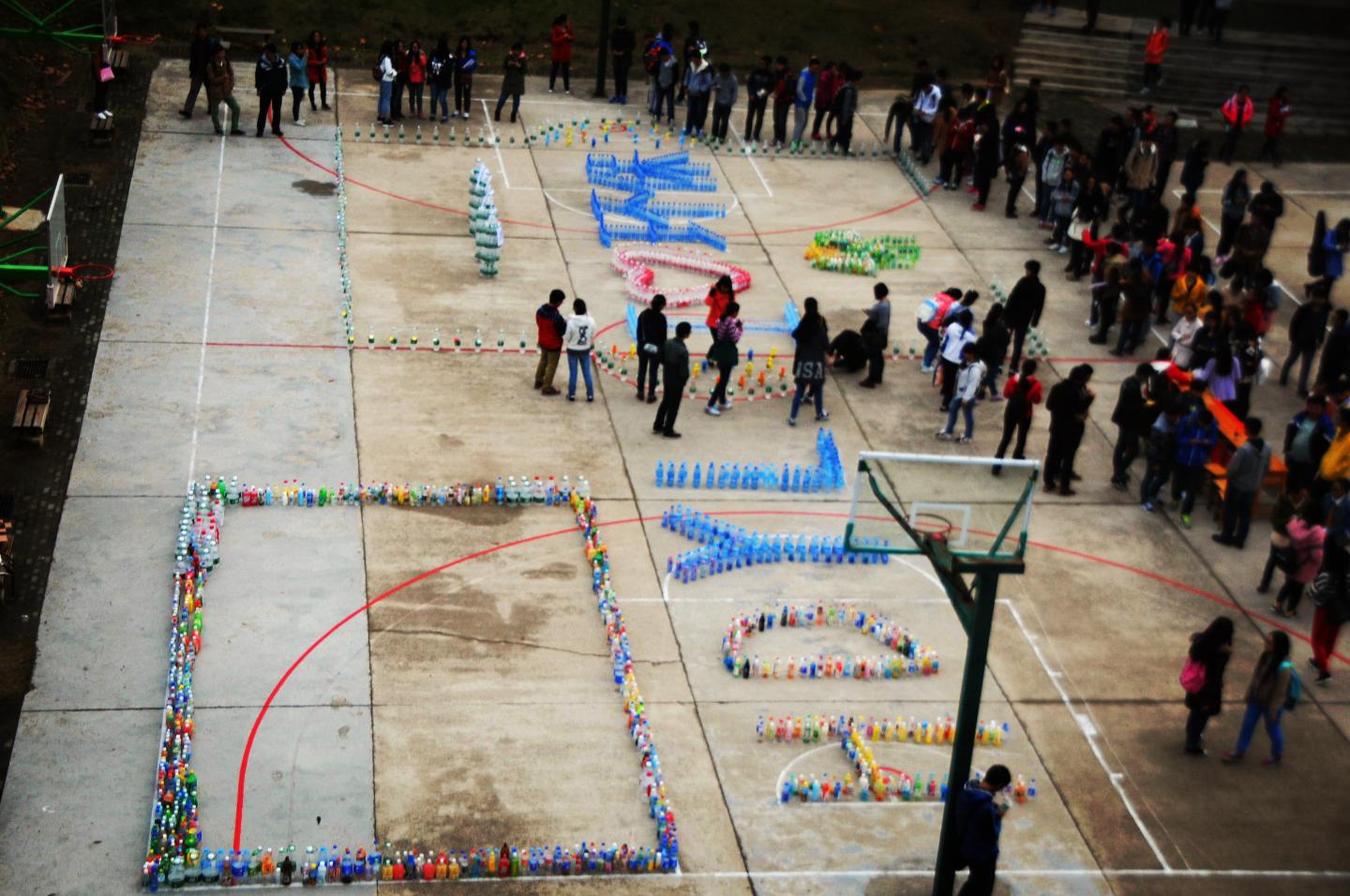 在活动现场,来自新闻传播专业的王国强正拿着手机拍照。“没想到这么多没用的空瓶摆在一起也很漂亮啊!”一边是由100多个空水瓶组成的湖大阳逻四个字拼音首写字母HDYL,另一边是由200多个空水瓶摆放而成,从左至右形成一个英文字母I、一个爱心和环协两个大字的图案。“愿望交流环节开始啦!”5点10分随着湖大环协会长的一声呐喊,阳逻的同学们陆续拿起选好的瓶子,撕下瓶身上的字条查看。“交友不厌新,交情不厌陈。能存先昔友,留示后来人”、“一箱AD钙奶”……