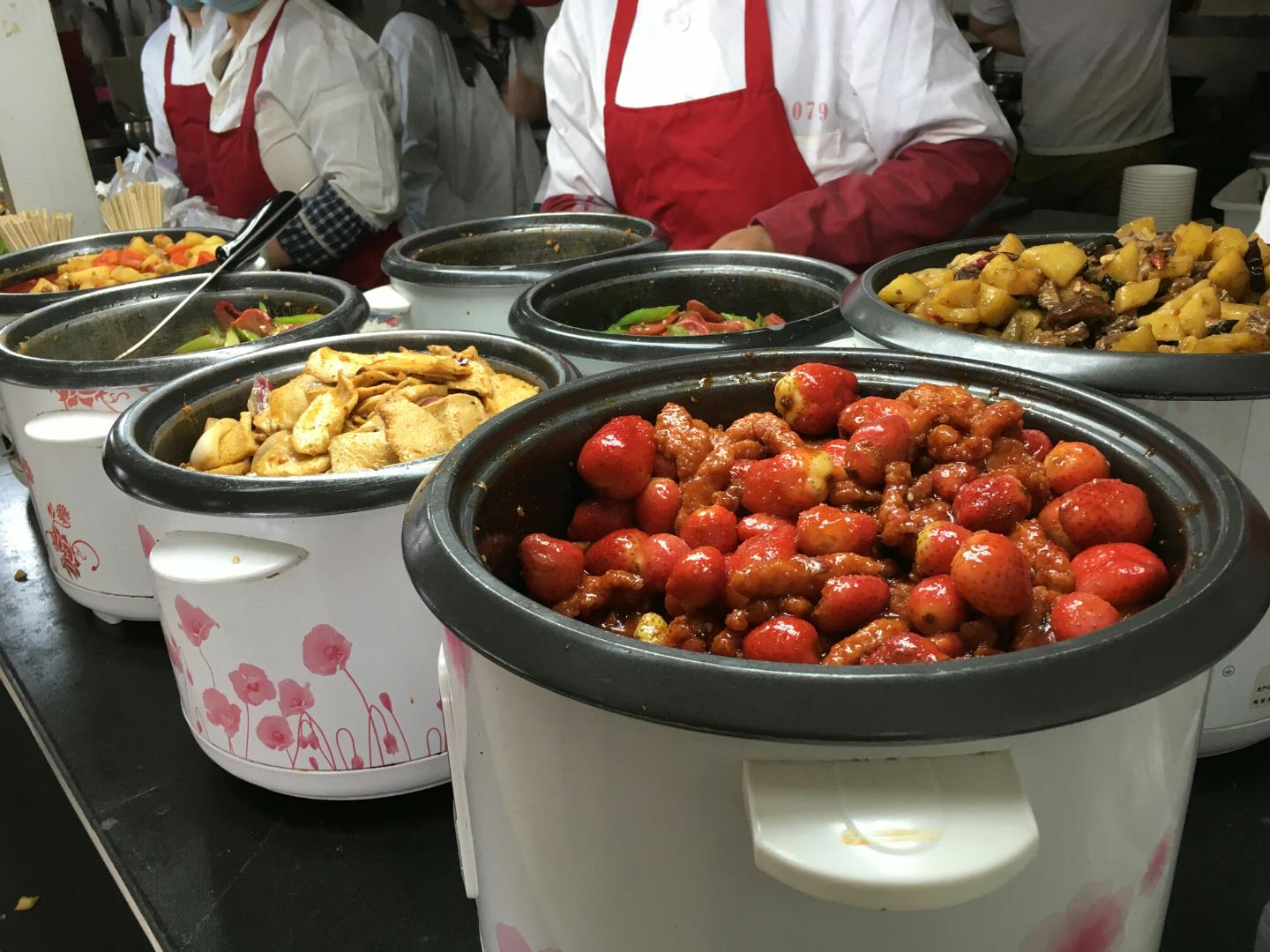 负责盖浇饭窗口打餐的李师傅表示今天草莓糖醋里脊的销量很不错,特别受女生们的欢迎。