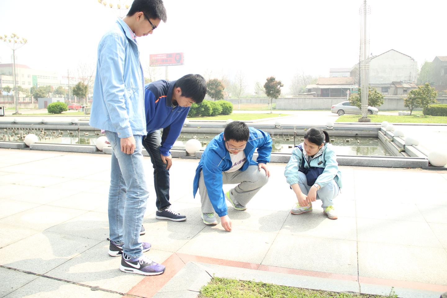 STAR巡天团阳逻校区的负责人李啸越与社团的几位成员带来纸张、粉笔、米尺、绳子聚集到学校升旗台旁。李啸越拿起粉笔在地上指划,跟其他几个人分析了测量原理。然后开始测量。他们先在旗杆上两米处绑绳,再测出投影中到绳处的影长,根据一定的角度关系,进而得到所在地——武汉的纬度:北玮113度。然后他们每隔3分钟标出旗杆顶端和绳两处的位置变化及对应时间,分别对比两处,以减小误差,得影子最短时的时间。但发现影长变化不大,物理学的李正天等提出了利用手机上的“指南针”,得到影子达到正北处即太阳直射的时间,通过计算,最终得到当地的经度为:东经114度。而实际查询到的当地实际纬度为北纬30度38分894秒,实际经度为东经114度34分781秒。“能从理论化为实践,倒是挺开心的。”物理学的李正天说到。