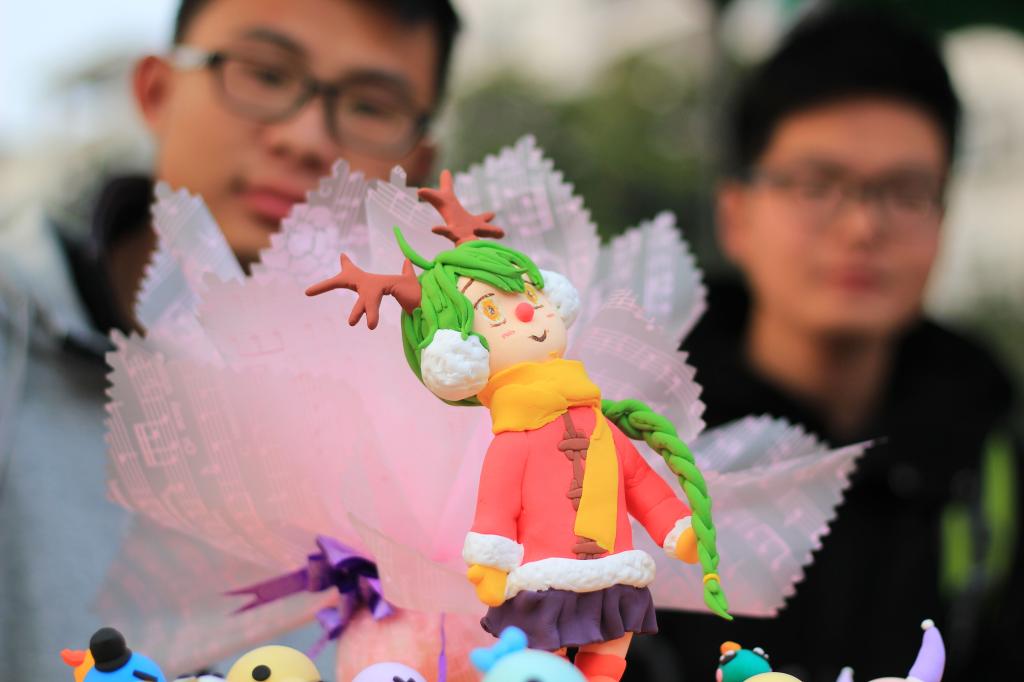 “湖小贝是用超轻黏土做成的。”2016级心理学专业学生王美晨介绍道,她是这个“私人定制”手工摊的摊主。“这个校园吉祥物就是一个同学订做的。”她们上午接到任务,订做的学生中午来看制作进程时,‘小贝’已经套上棉靴穿上红袄,就差个脑袋。“我为了做得更好,下午落下摊子潜在宿舍做,关了手机,花了3小时才最终完工。”她指着“湖小贝”说道,“结果手机被打爆了,她们太期待了。”她笑着说。