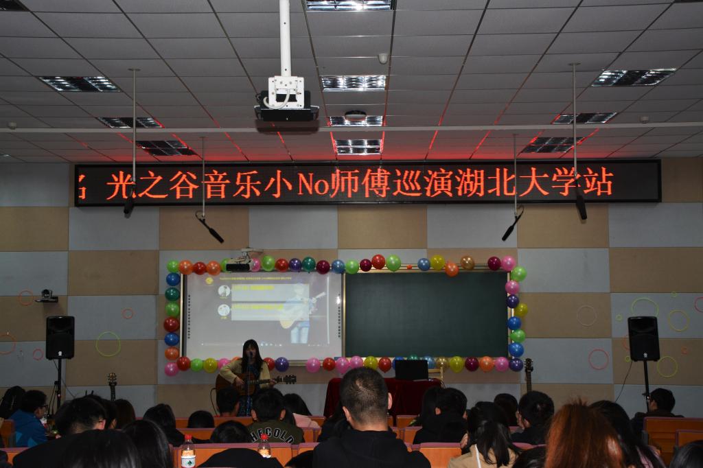 小NO是武汉光之谷音乐指弹教师,全国最大指弹社区“指弹中国”版主,被广大网友誉为全网最好的押尾风格指弹吉他老师。他在现场把音乐和讲解完美融合,在演奏中穿插介绍了贝司、鼓、旋律、和声的演奏方法,并告诉听众押尾指弹是将四种演奏方法合在一起的一种演奏风格。他先后弹奏了《you and me》《Big Blue Ocean》《极光》等曲目,现场大屏幕上疯狂刷屏,一串串的666表达了听众们的心情。本场巡演还邀请到了武汉传媒学院吉他社社长吴天成,他给湖大学子展现了他令人眼花缭乱的炫酷指法,还笑称:“我讲的没有我弹的好。”