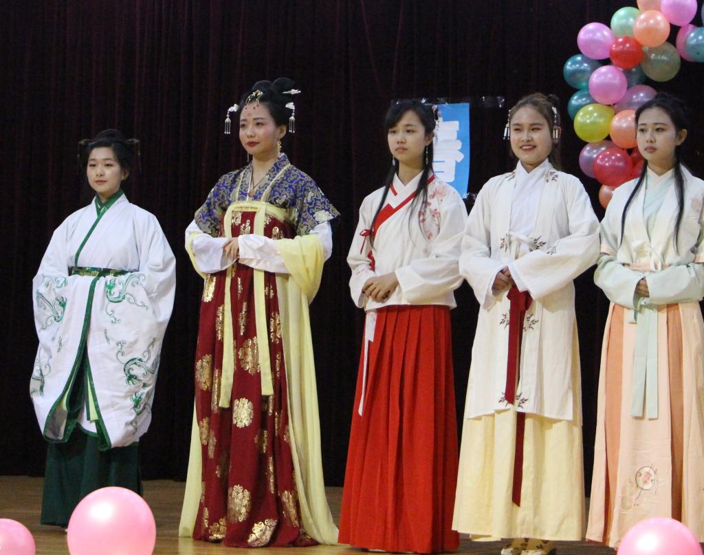 活动中,身穿各式汉服的国学社成员一字排开,主持人夏雨彤就该社成员展示的汉服款式向观众一一提问。随后,湖北大学国学社阳逻校区负责人刘龙海上台向观众科普汉服中襦裙、曲裾等款式的特点,就襦裙中对襟、半臂、齐腰等形制进行了简要讲解,并对汉服的特点进行了简要阐述:汉服是平面剪裁、无肩缝、不收腰,“(汉服)比较宽松,但又是系带来束,所以可以自由调节”、“很好地体现了属于中国人的美感”。