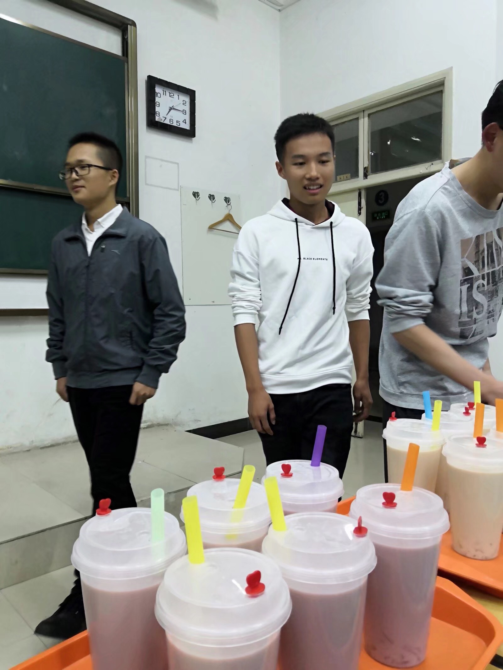 10月14日晚上,2018级弘毅苑旅游管理专业全体男生端着放满了整整67杯新鲜奶茶的托盘进了班会教室B308。这是一份来自班级团支书牛文龙的福利。
