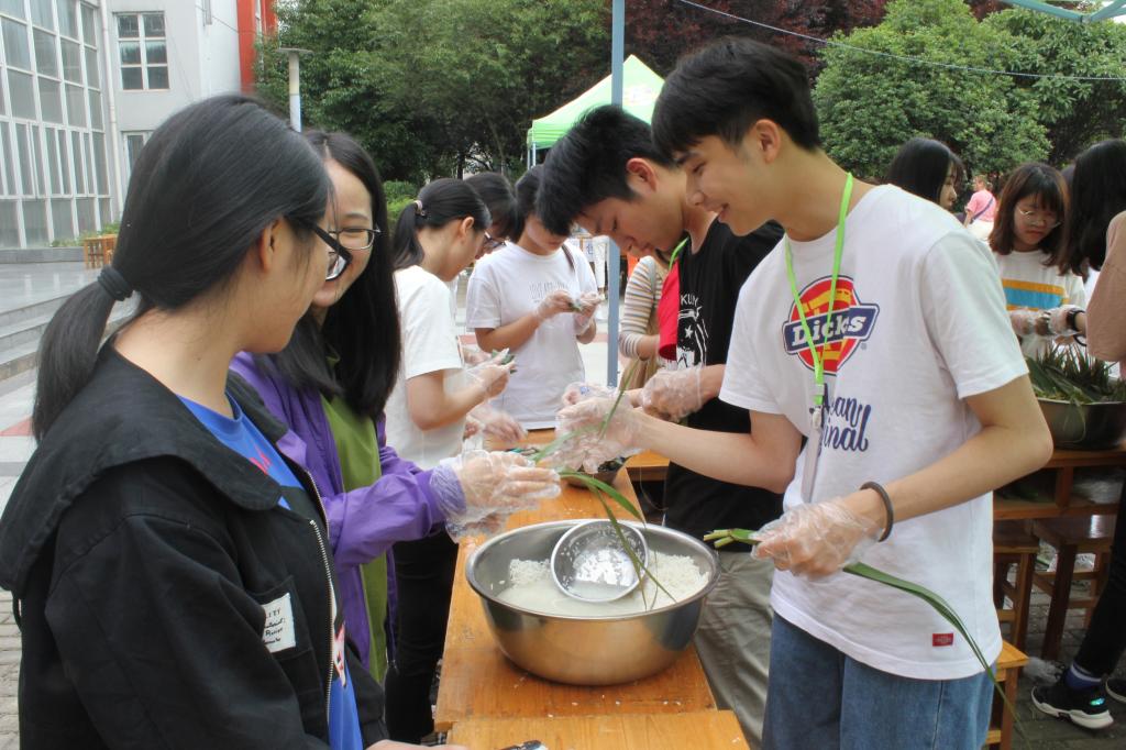 活动当天,新鲜的粽叶及糯米吸引了不少学生的目光。学生们围聚在手工制作区。经过一番“加工”,一个个精巧的粽子“活跃”在镜头前。2018级国际经济与贸易专业学生赵雨倩在亲手制作了粽子后,更是第一时间打开了视频通话,和父母分享这份喜悦。同时,游戏区的活动也精彩纷呈。志愿者协会共推出了“你画我猜”“表情传递”“正话反说”等活动供学生们参与,并准备了丰厚奖品。