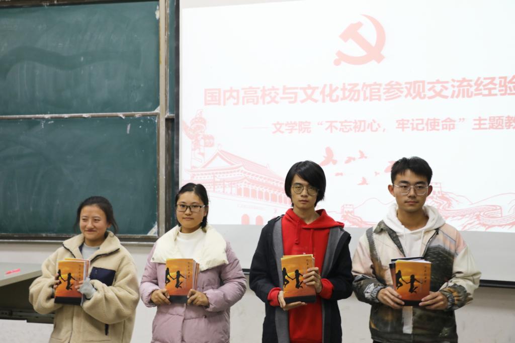 邓超分发了推荐书目《成长的力量》,希望这本书能从考研、就业、保研、出国四个方面给新生带来帮助。然后由2017级中文基班学生揭迎迎、张莉梅、王志广分别就前往北京、上海以及南京访学的经历进行宣讲。