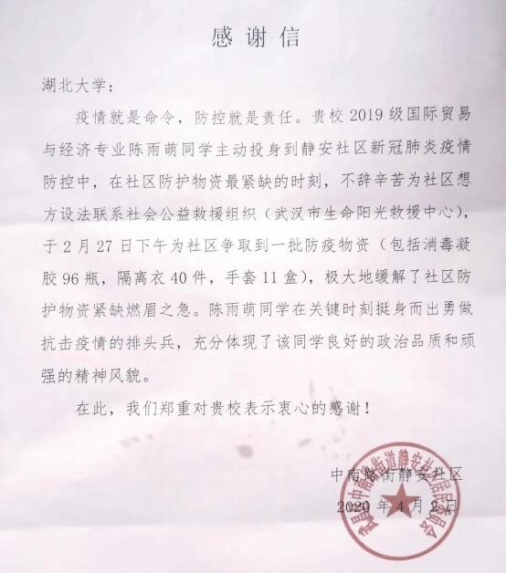 “贵校2019级国际贸易与经济专业陈雨萌同学主动投身到静安社区新冠肺炎疫情防控中......充分体现了该同学良好的政治品质和顽强的精神风貌。”4月2日,湖北大学收到了武汉市武昌区中南路街道静安社区发来的感谢信。