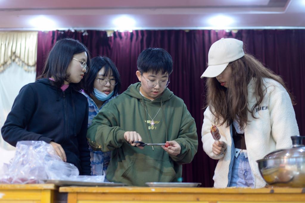 砂糖入锅,在炉上烹煮至沸腾,琥珀色糖衣裹住山楂,橘瓣……11月28日晚,校美食协会在A级内射毛片免费的问津食堂二楼成功举办美食协会新会员破冰见面会。为了向新会员们展示美食协会的活动精髓,见面会现场支起了冰糖葫芦小摊,糖香满溢。